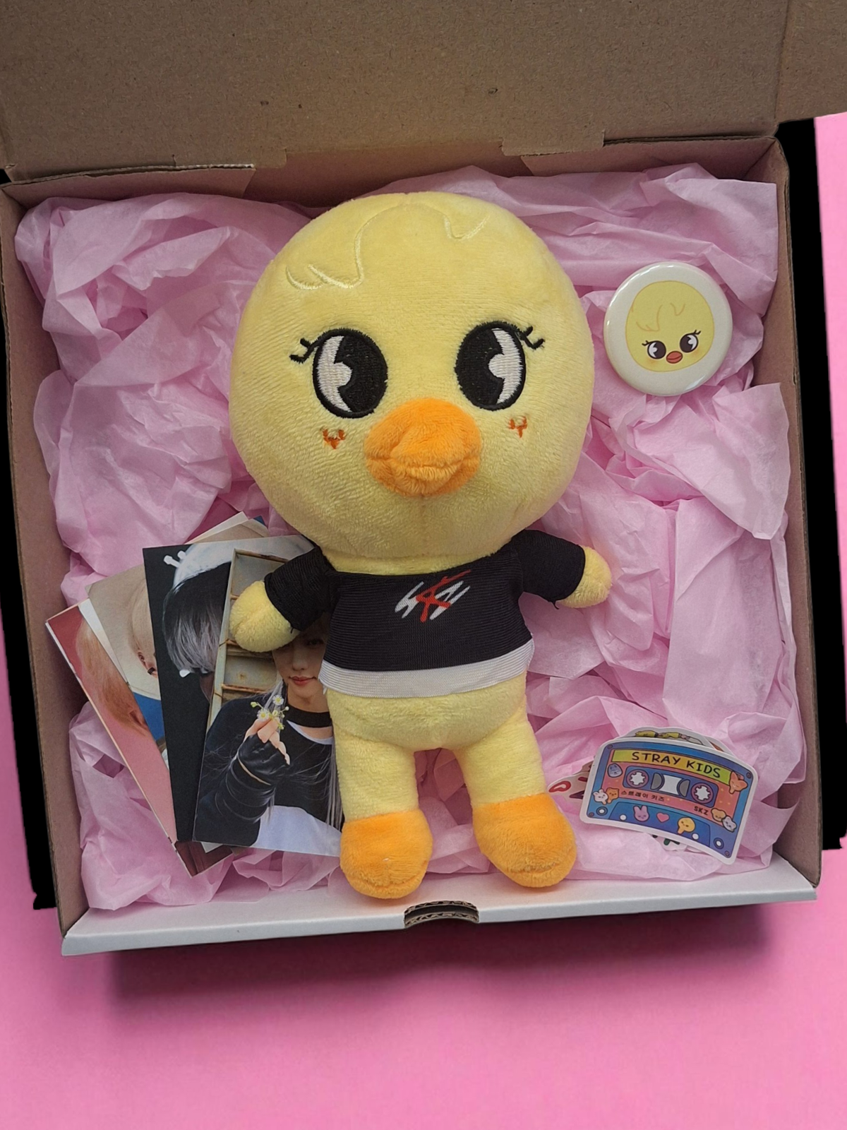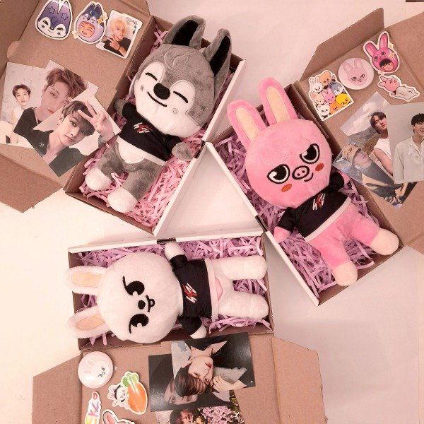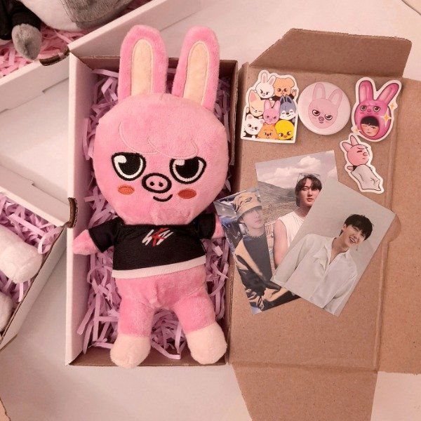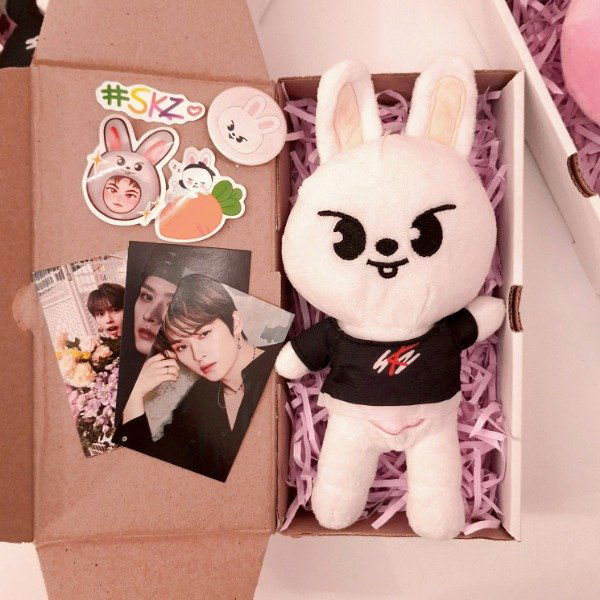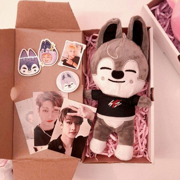 ¡Tu bias SKZOO llegó en su cajita súper cute! 🥰 Peluche abrazable + fotitos + stickers y prendedor, todo listo para acompañarte y llenar tu colección de amor STAY 💫