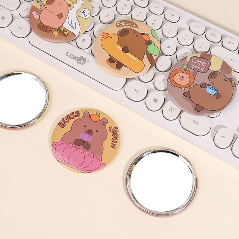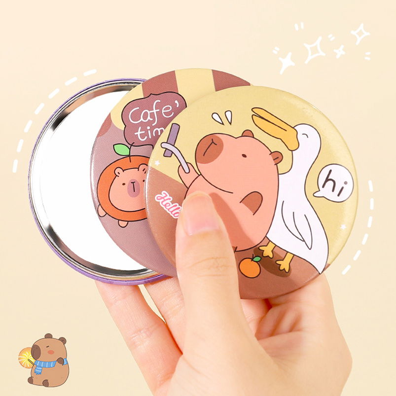 Un espejo tan cute como vos, con diseño adorable de capibara para llevar siempre en tu cartera. Tiene un diámetro ideal de 7 cm, justo para retocar tu look en cualquier momento y lugar 💖. Además, la calidad de sus tintas fotográficas hace que el dibujo se vea súper nítido y duradero, para que tu capi favorito te acompañe siempre.