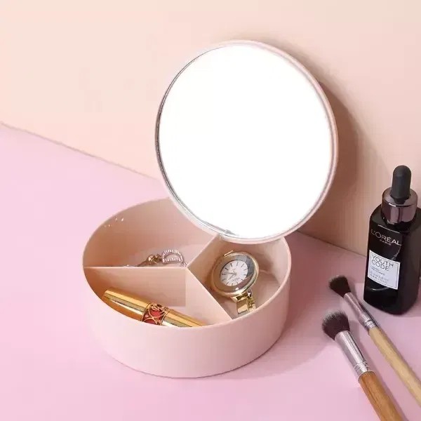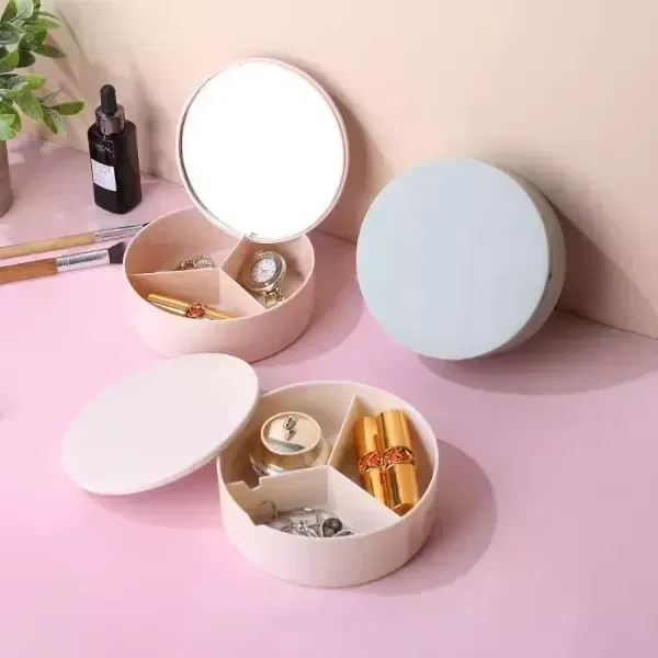 Un must para tener todos tus accesorios organizados y a mano con estilo ๐. Este organizador circular tiene 3 compartimentos ideales para tus cositas favoritas y una tapa con espejo que podรฉs apoyar para verte siempre perfecta.