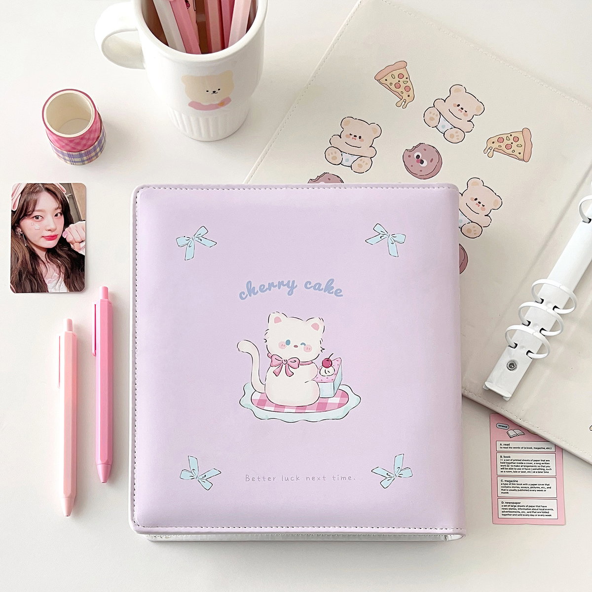 Este binder tamaรฑo A5 incluye 10 folios de alta calidad, con espacio para hasta 80 photocards, ideal para mantener tu colecciรณn organizada y protegida ๐