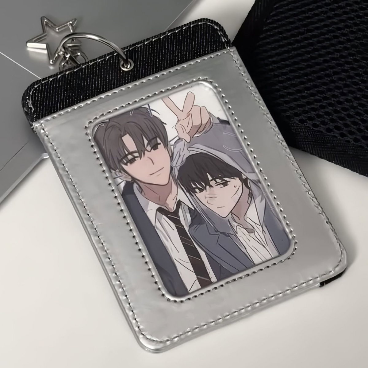 Un holder elegante y minimal para tus cards mรกs especiales ๐ฅบ๐ซ Su acabado plateado tipo cuero PU mezclado con tela de jean le da un look sofisticado que combina con todo ๐
