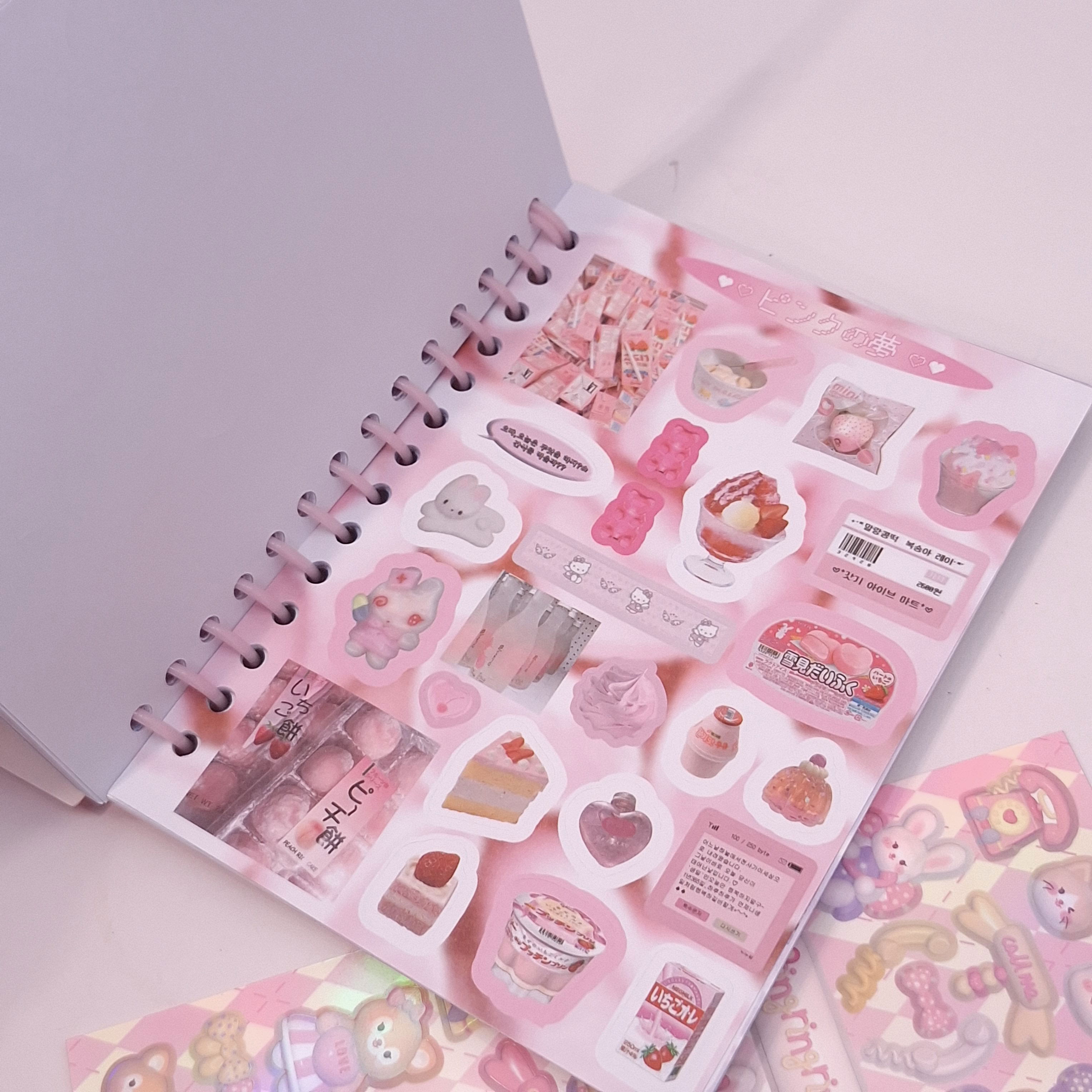 Un sueño hecho cuaderno 🌈✨ Trae 45 páginas repletas de stickers con temáticas súper variadas: comida kawaii 🍓, estética Y2K 💿, vibes de los 2000’s 💕, letras coreanas y japonesas 🩵, corazones, estrellas y mucho más 💫